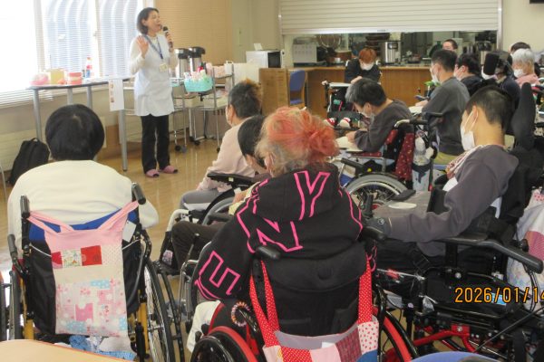 1/14 13:30から14:30まであゆ夢、愛らんど利用者、職員全員が歯科衛生講習会を開きました。虫歯菌と歯槽膿漏菌が普段どこに潜んでいるのか?一般的ジュースには砂糖